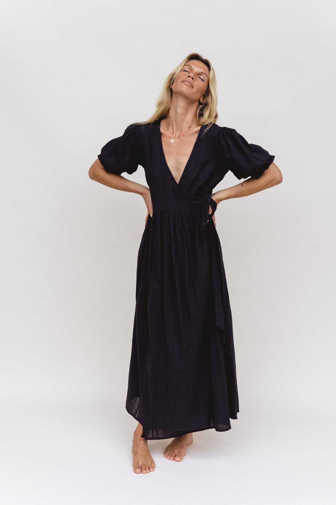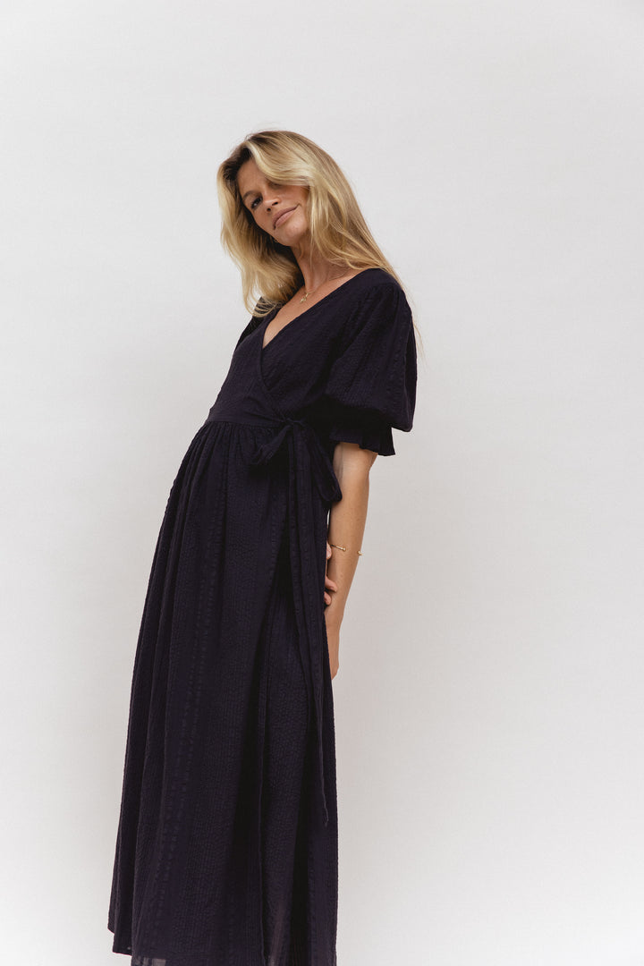This is hands down my favourite DOI dress so far. The style is so flattering and the texture and sleeves add so much to the dress. It has a tie on the inside as well so you don't need to worry about windy days. I'm a size 8 and went the xs. Perfect fit and love that the elastic in the sleeves is so soft and not tight.