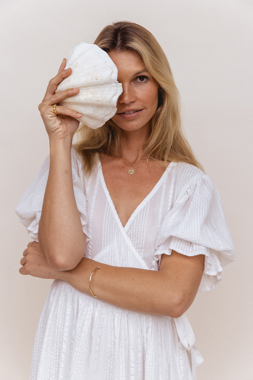 The Uma Maxi Dress is a classic piece slowly and ethically handcrafted from 100% cotton with soft textured stripe detailing. This self-adjustable wrap design provides the perfect balance between a casual and styled look with the special addition of pockets and cute ruffle sleeves for an elegant finish.
