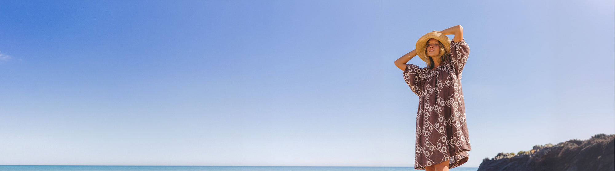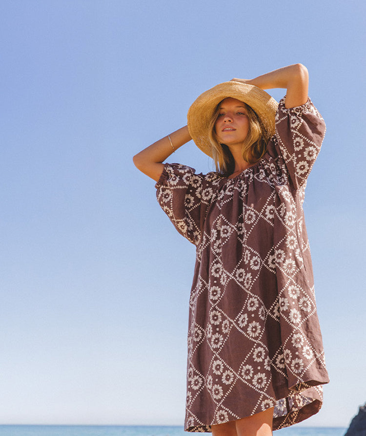Dahlia Mini Dress Maple — beach with rocky headland, wide-brim hat styling, hand block print linen mini, maple brown geometric daisy pattern | Daughters of India Dahlia Mini Dress Maple — model with straw hat looking up, arm raised, showing hand block print linen mini with diamond daisy motif, maple brown artisan print | Daughters of India