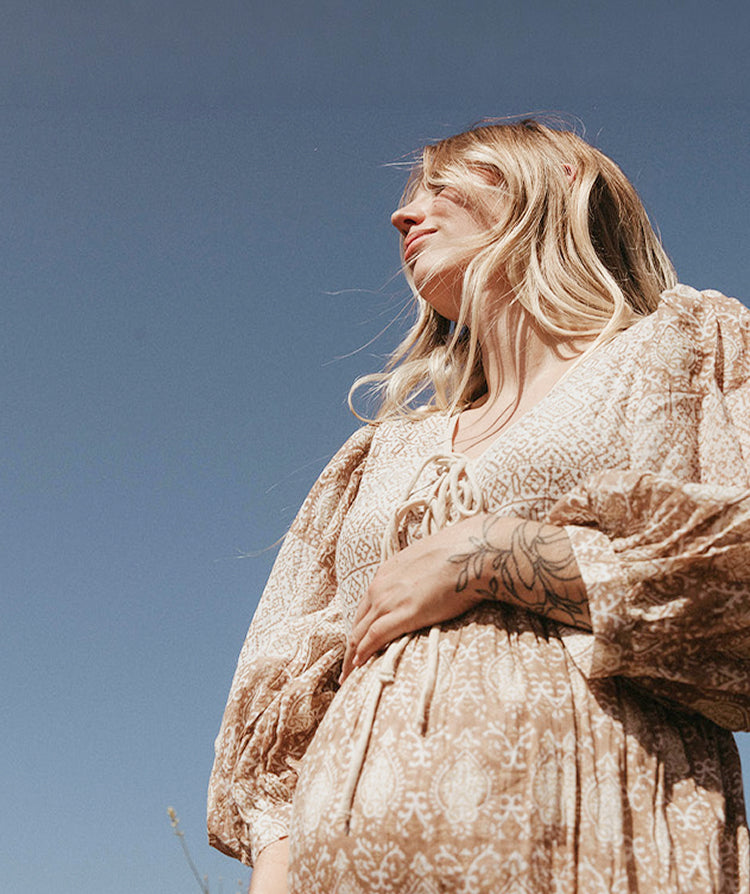Daughters of India Jasmine Midi Dress in Shell — full length on rocky shore, hand screen print cotton with balloon sleeves Daughters of India Jasmine Midi Dress in Shell — over-shoulder glance on coastal rocks, balloon sleeve detail